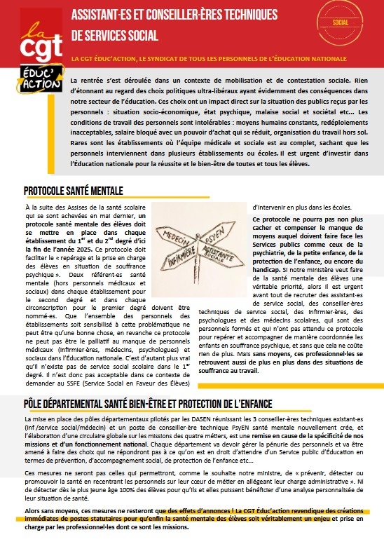 La CGT Educ’action appelle tous les personnels sociaux de l’Éducation nationale (service social en faveur des élèves, service social en faveur des personnels et service social en faveur des étudiant·es) à faire grève le 19 mars pour exiger la revalorisation de