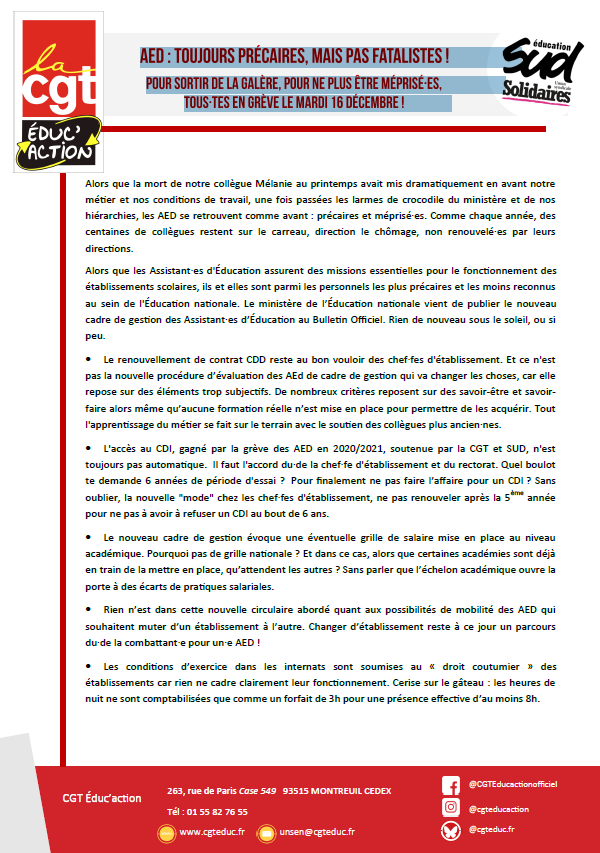 AED : toujours précaires, mais pas fatalistes ! Pour sortir de la galère, pour ne plus être méprisé·es, tous·tes en grève le mardi 16 décembre