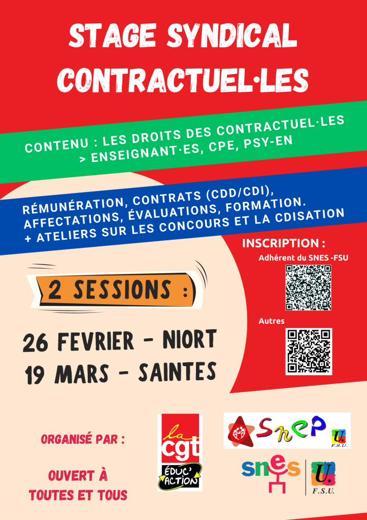 Le SNES-FSU, le SNEP-FSU et la CGT Educ'action organisent sur une journée, un stage syndicale contractuel·les enseigant·es, CPE et PsyEN