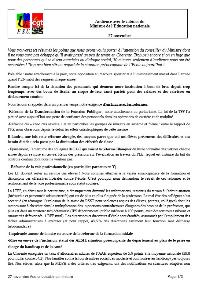Vous trouverez ici résumés les points que nous avons voulu porter à l’attention du conseiller du Ministre dont il ne vous aura pas échappé qu’il avait passé un peu de temps en Charente. Trop peu encore si on en juge que pour des personnes qui se disent attachées au dialogue social, 30 minutes seulement d’audience nous ont été accordées ! Trop peu bien sûr au regard de la situation préoccupante de l’Ecole aujourd’hui !