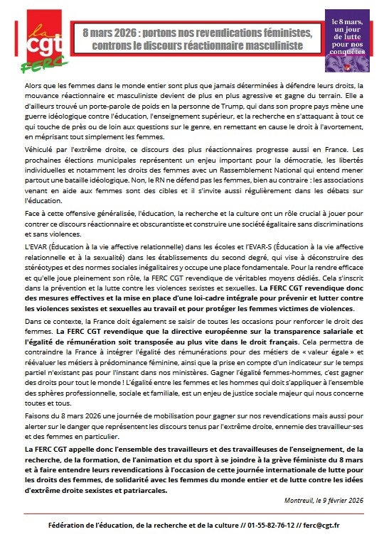À l'occasion du 8 mars, la CGT appelle l’ensemble des travailleuses et travailleurs à se mobiliser pour l’égalité réelle, l’augmentation des salaires, la fin des violences et la reconnaissance de toutes les professions majoritairement féminines.