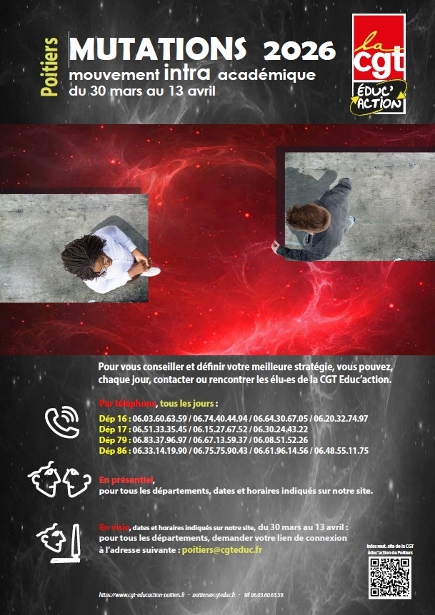 Dans le cas de ta demande de révision, pour être conseillé et accompagné, contacter les élu·es et  l’équipe académique compétente sur les questions de carrière et de mobilités de la CGT Educ’action.
