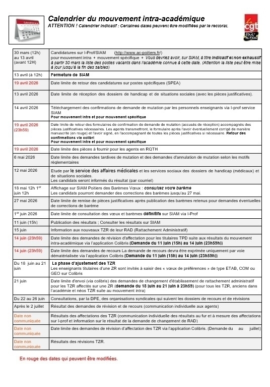 Calendrier du mouvement  intra-académique de la CGT Educ'action