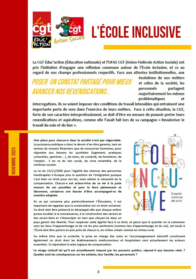 La CGT Éduc’action (Éducation nationale) et l’UFAS CGT (Union Fédérale Action Sociale) ont pris l’initiative d’engager une réflexion commune autour de l’École inclusive, et ce au regard de nos champs professionnels respectifs. Face aux attentes institutionnelles, aux évolutions de nos métiers et celles de la société, les personnels partagent majoritairement les mêmes problématiques et interrogations. Ils se voient imposer des conditions de travail intenables qui entrainent une importante perte de sens dans l’exercice de leurs métiers. Face à cette situation, la CGT, forte de son caractère interprofessionnel, se doit d’être en mesure de pouvoir porter leurs revendications et aspirations, comme elle l’avait fait lors de sa campagne « Revaloriser le travail du soin et du lien ».